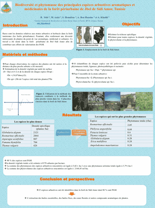 Biodiversité et phytomasse des principales espèces arbustives aromatiques et médicinales de la forêt périurbaine de Jbel Sidi Amor, Tunisie. B. Stiti a, M. Azizi, S. Hemdène, A. Ben Hassine et A. Khaldi . Institut National de Recherches en Génie Rural, Eaux et Forêts. BP10, Ariana, Tunisie. Objectifs : Rares sont les données relatives aux strates arbustive et herbacée dans la forêt . Estimer la richesse spécifique tunisienne (les forêts périurbaines). Pourtant, elles renferment une diversité . Estimer pour toutes espèces: la densité végétale de plantes du point de vue aromatique, médicinal et culinaire. Ce travail a été mené dans la forêt périurbaine de Jbel Sidi Amor afin de contribuer aux efforts de valorisation des PAM.