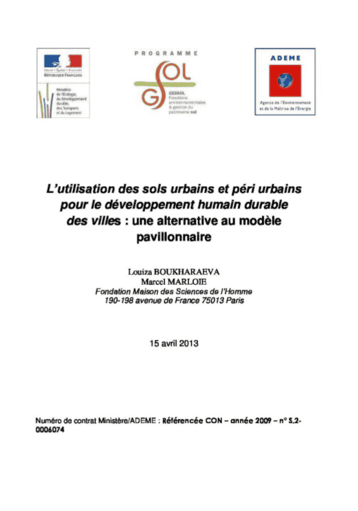 L’utilisation des sols urbains et péri urbains pour le développement humain durable des villes : une alternative au modèle pavillonnaire Louiza BOUKHARAEVA Marcel MARLOIE Fondation Maison des Sciences de l’Homme 190-198 avenue de France 75013 Paris 15 avril 2013
