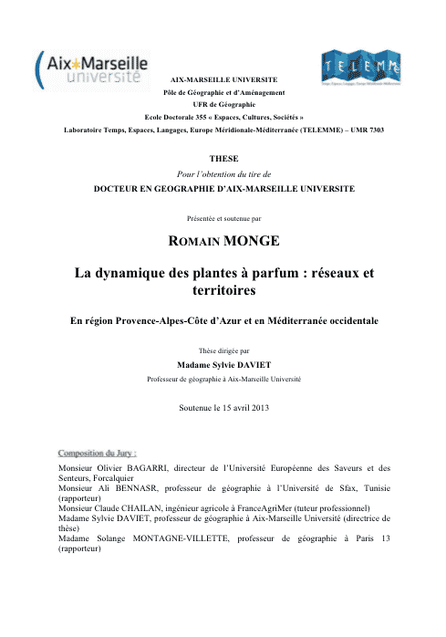 Romain Monge La dynamique des plantes à parfum : réseaux et territoires en région Provence-Alpes-Côte d’Azur et en Méditerranée occidentale
